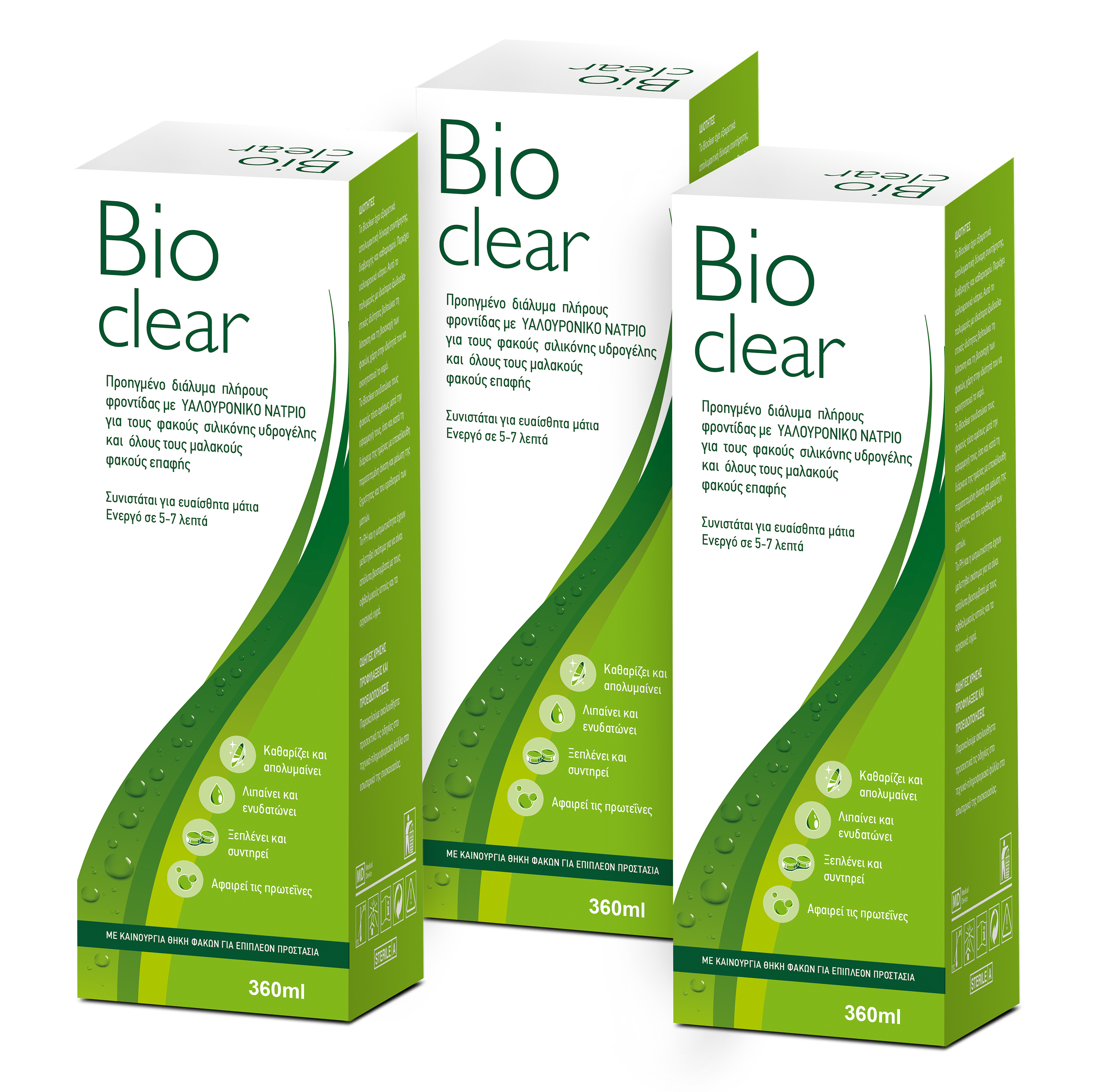 3 BIOCLEAR συσκευασίες 360ml προηγμένων υγρών φροντίδας φακών επαφής, πολλαπλών χρήσεων. Το BIOCLEAR είναι ειδικά σχεδιασμένο για τους φακούς σιλικόνης υδρογέλης και για όλους τους τύπους μαλακών φακών επαφής. Προσφέρει φυσική άνεση και ενυδάτωση.
